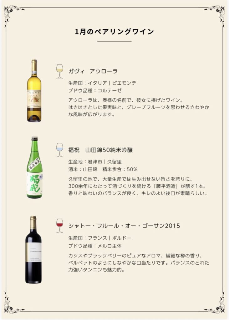 1月のペアリングワインのメニューです。今月は珍しく日本酒をペアリングしています。
