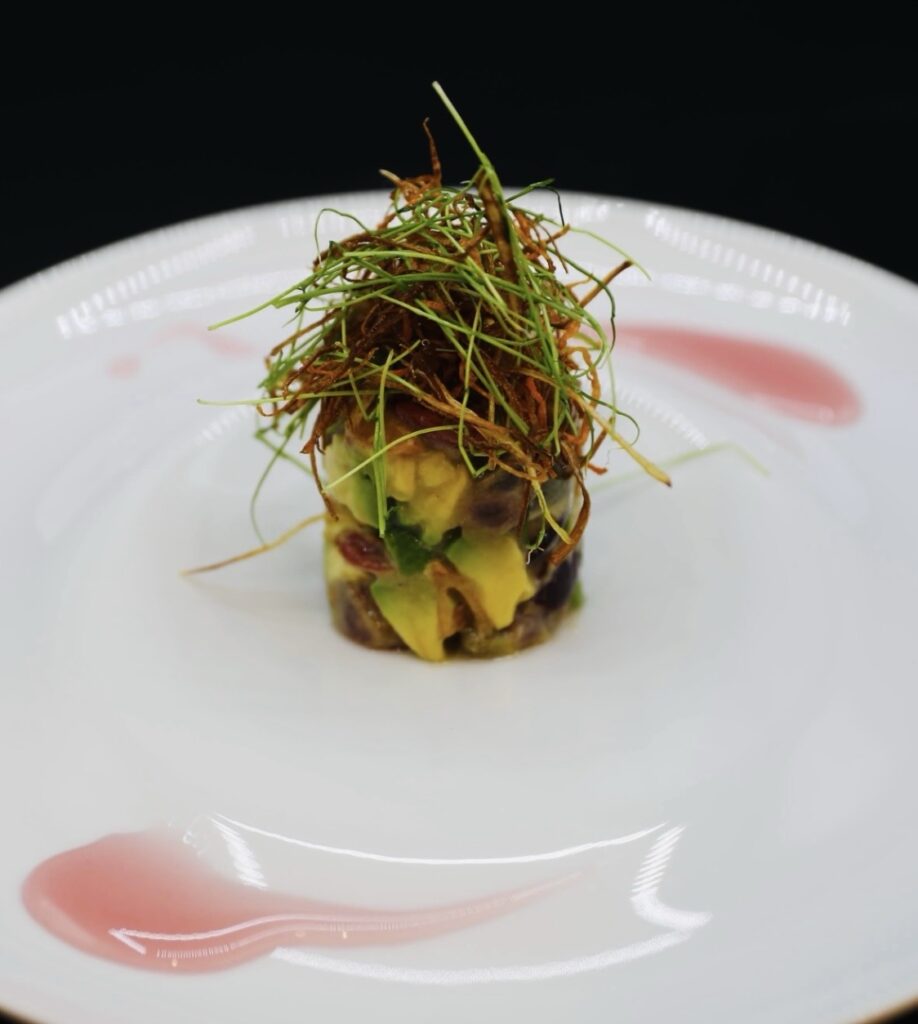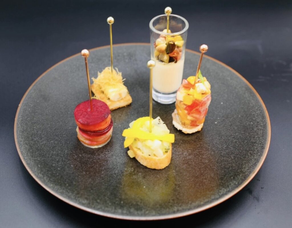 自然薯のガダイフ揚げ/生春巻きのカプレーゼ/ビーツのミルフィーユ/アボガドのカナッペ/ドライフルーツとフォアグラのフラン