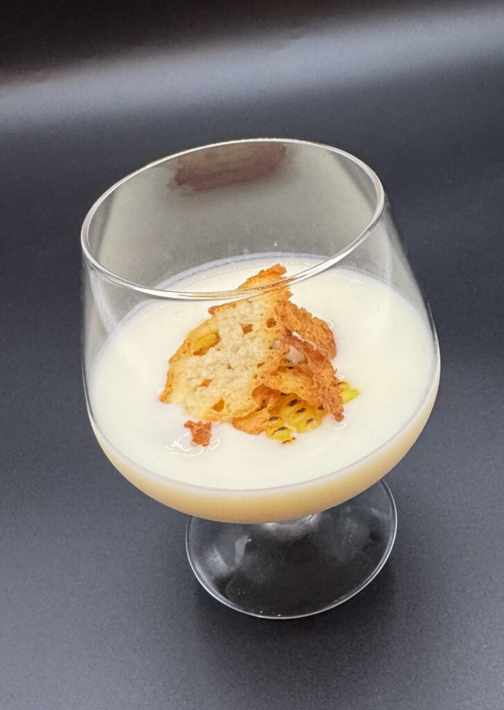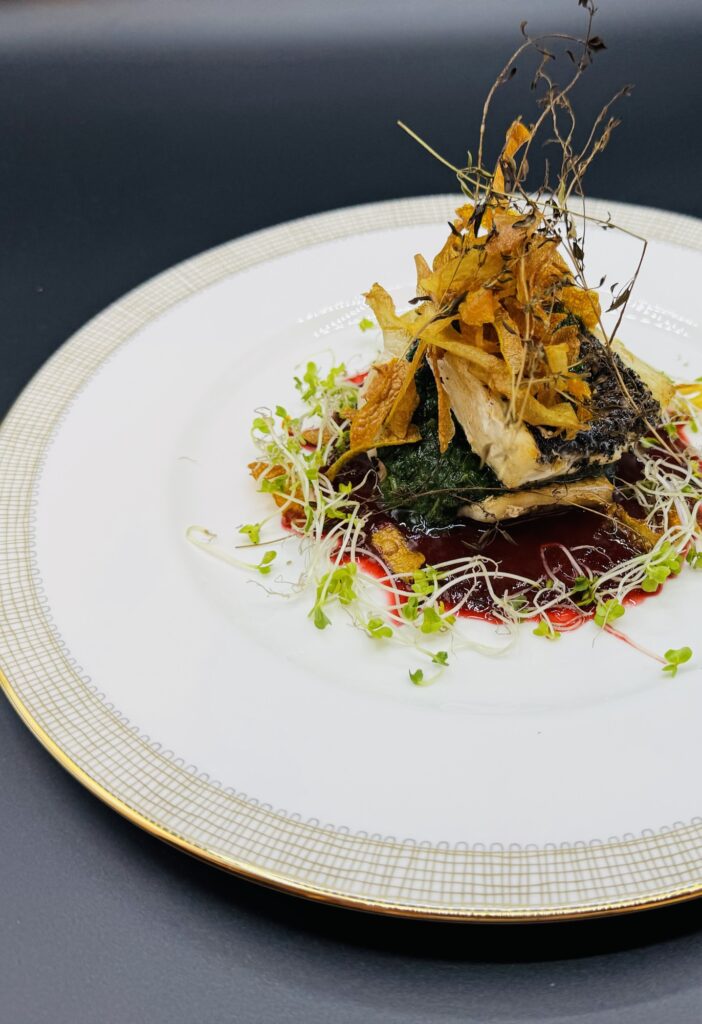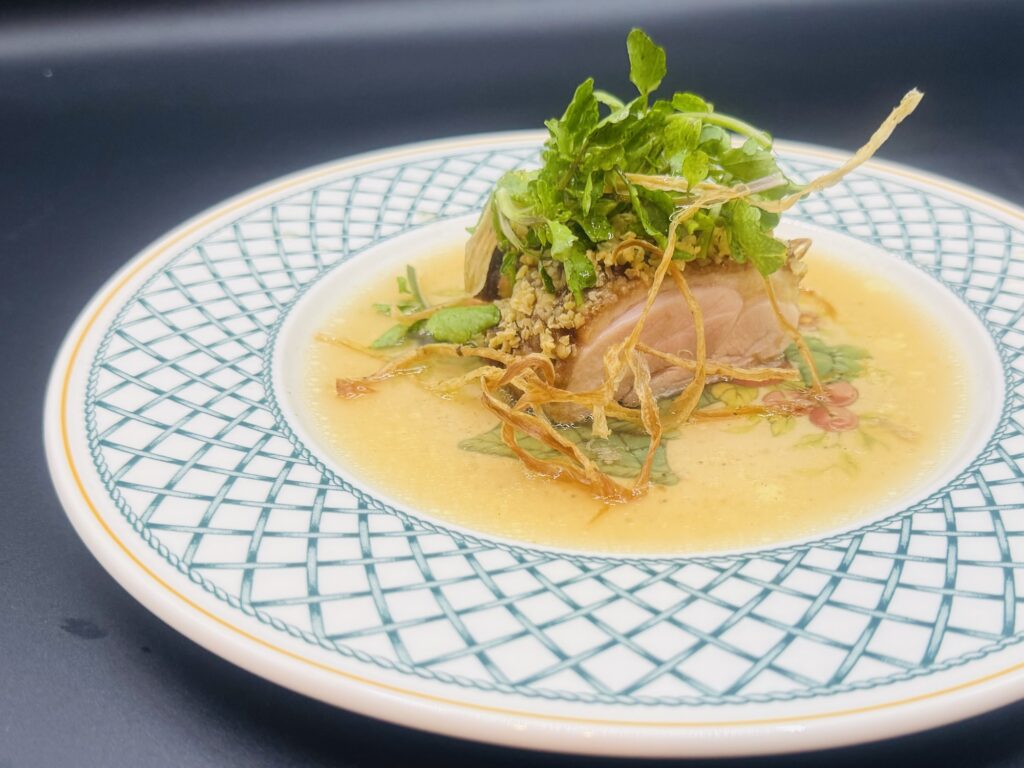 地鶏の上に栗のペースト、生ピーナッツをのせグリルし、濃厚な鶏の旨み出汁がソースです。ワインが楽しみな1品です。