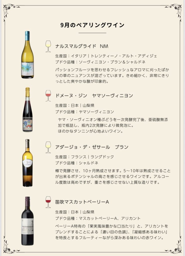 9月のペアリングワインになります。ワインは4種類、食前酒、クラフトビール、グラッパとアルコールは7種類です。